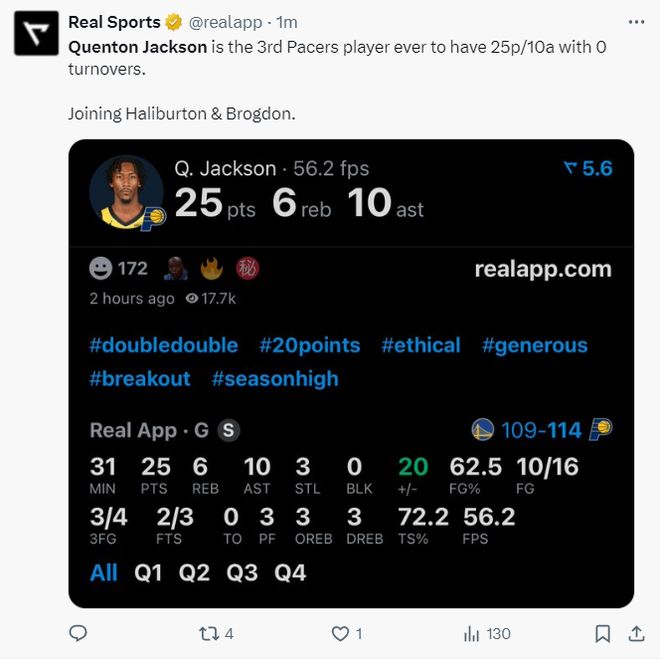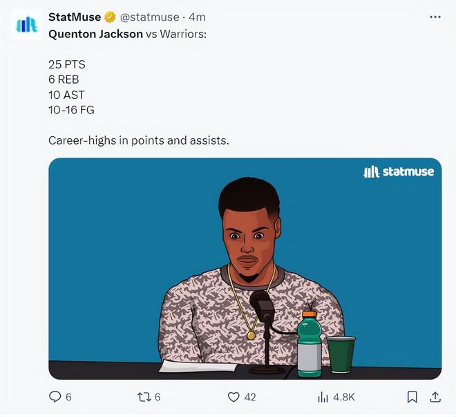 而昆廷-杰克逊全场比赛31分钟,16中10,三分4中3,罚球3中2,拿到25分10助攻6篮板3抢断,命中率62.5%,三分命中率75%,真实命中率65.4%。